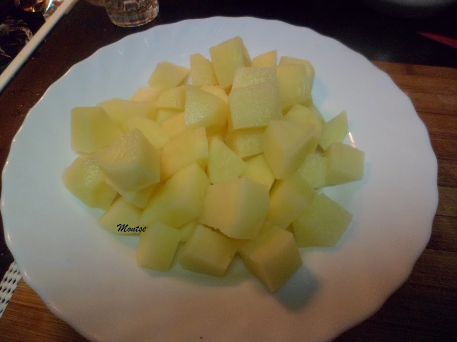 Mientras en otra sartén freiremos unas patatas a cuadrados.