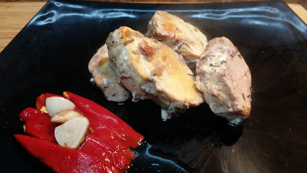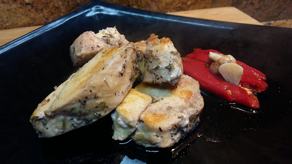 Acompañar al pollo con pimientos asados y aliñar con 1 cucharada de la salsa del pollo