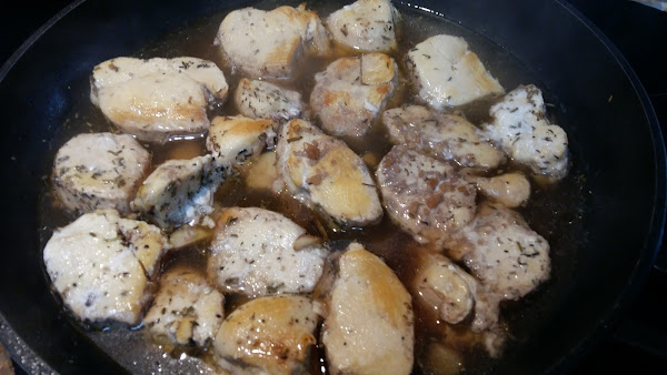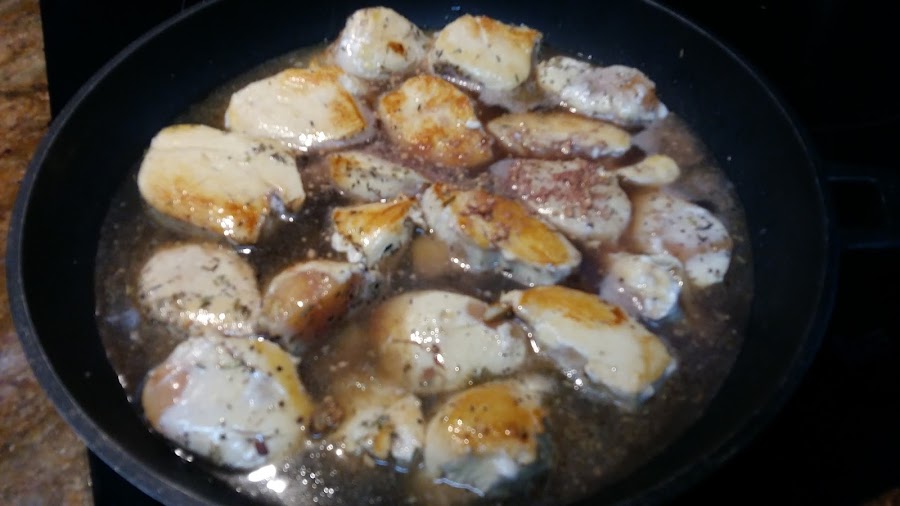 Cuando el pollo esté doradito, añadir el vino del mortero y un vaso de caldo de pollo o verduras.