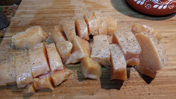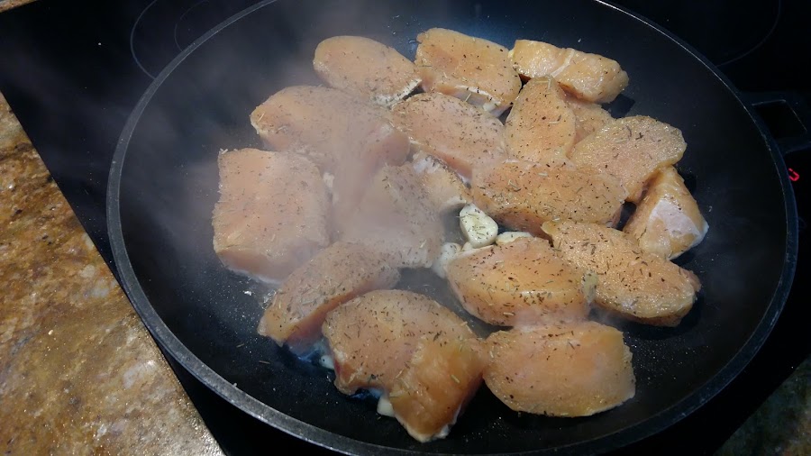 Para hacer la receta he usado pechugas de pollo que tenía congeladas, pero quedará más buena si usas el pollo cortado a octavos con hueso y todo.