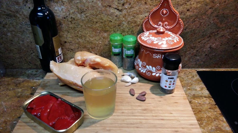 1 pollo cortado a octavos, 4 dientes de ajo, 1 cucharada de aceite de oliva, hierbas mediterráneas (tomillo y romero) 2 cucharadas de vino tinto, 1 vaso de caldo de pollo o de verduras, 1 lata de pimientos asados, 3 almendras tostadas, sal y pimienta negra molida.