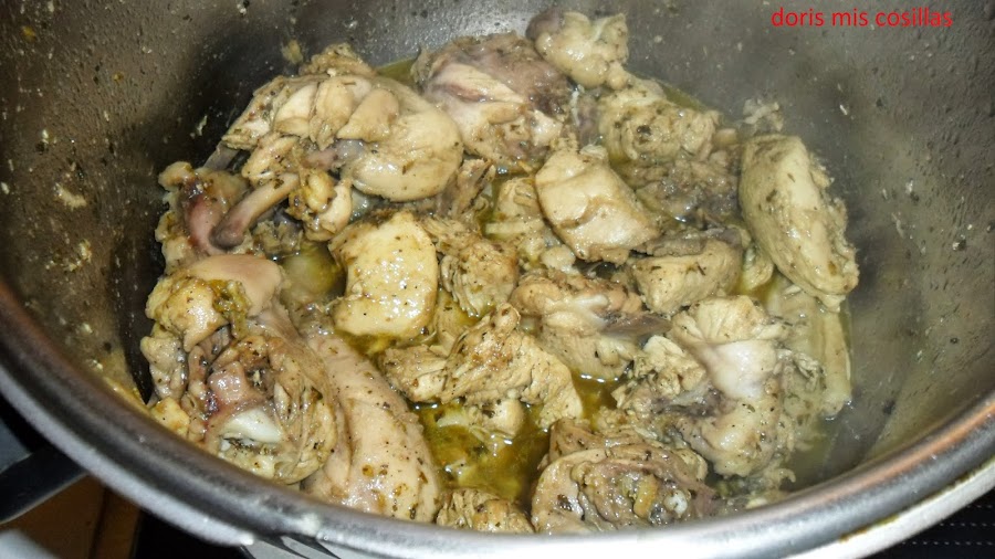 Una vez ligeramente dorado los ajos, vamos poco a poco agregando por tandas el pollo para que se dore por todas partes a fuego vivo.