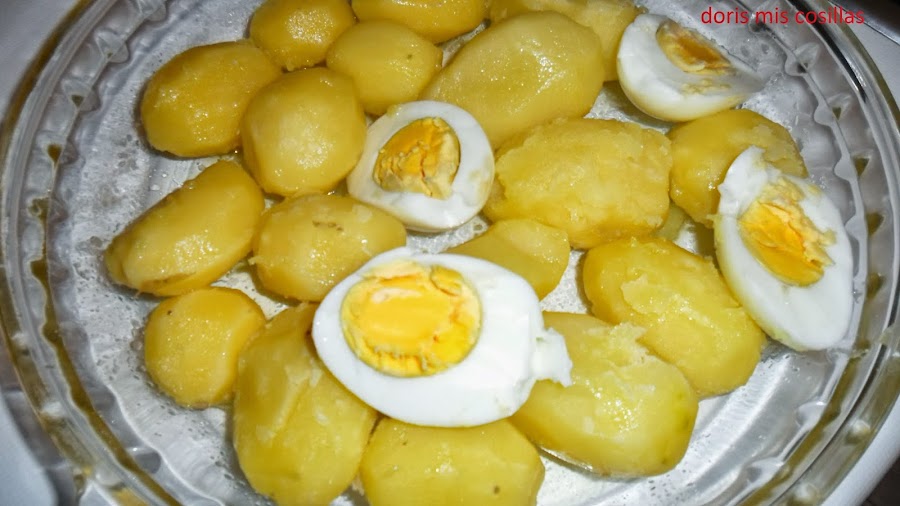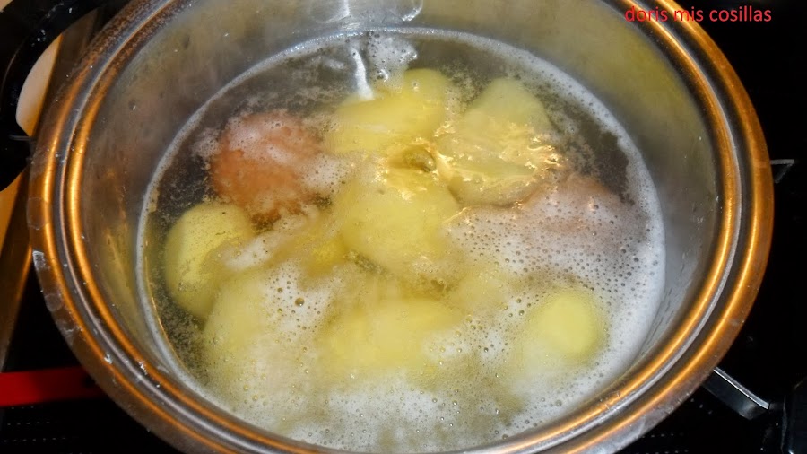 Bajar el fuego, agregamos el medio vaso de vino blanco y dejamos reducir la salsa hasta dorar removiendo de vez en cuando no se pegue. Mientas...cocemos las patatas con piel y huevos en una cazuela con agua y un poco de sal unos minutos y ver que están tiernas pero enteritas.