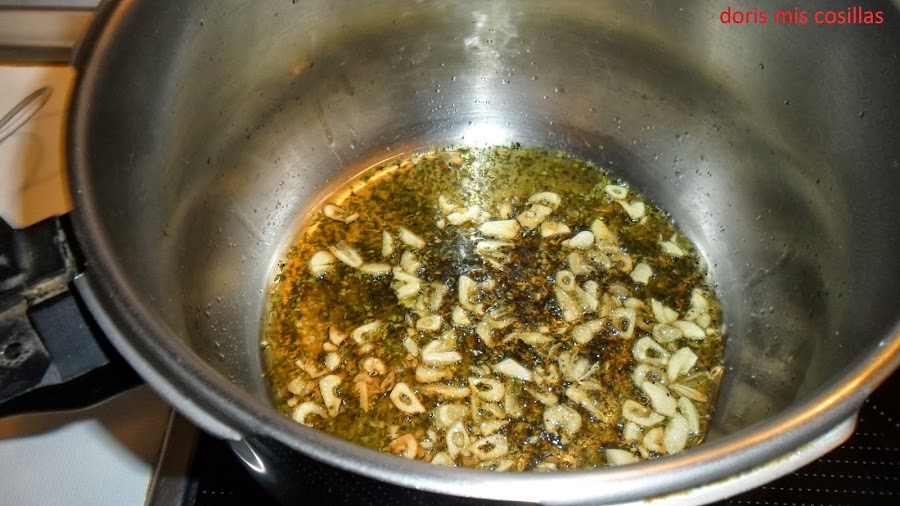 Poner al fuego una cazuela profunda con un chorro de aceite de oliva y salteamos los ajos, perejil, orégano,pimienta, curry y sal unos minutos.
