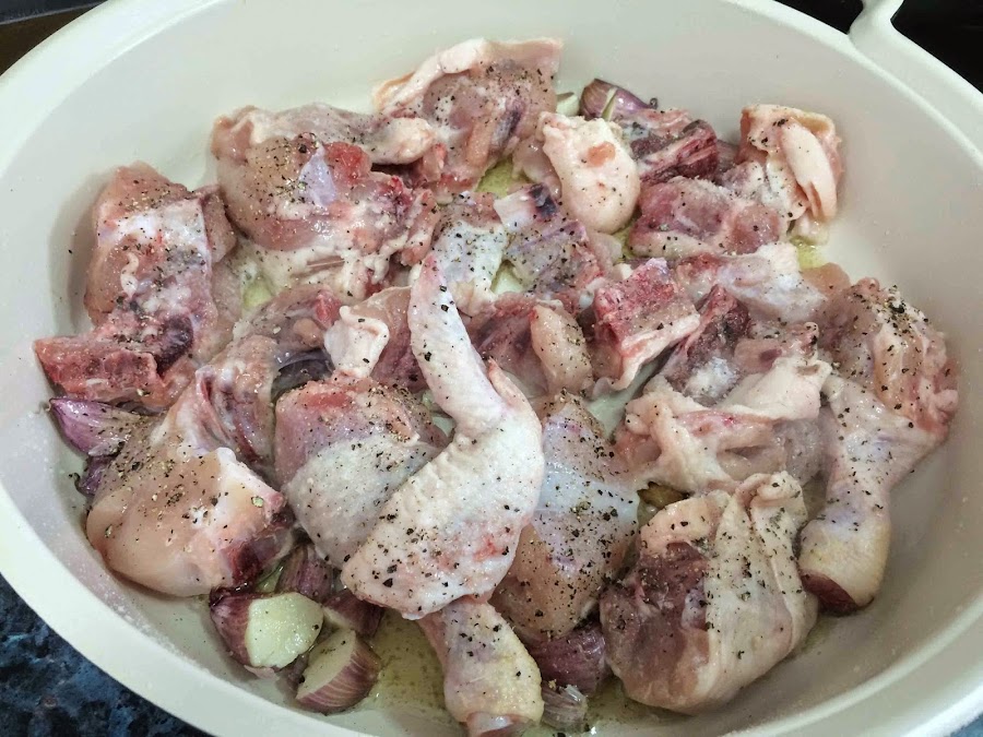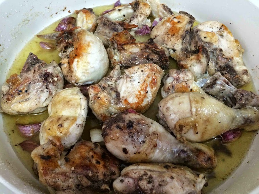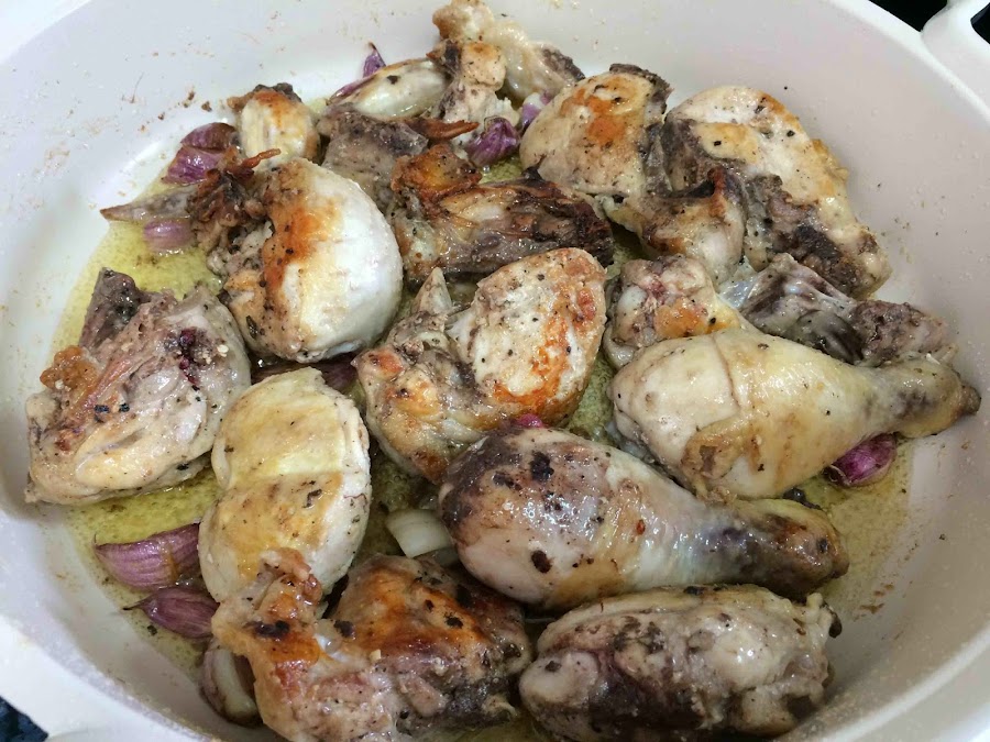 Cuando los ajos estén hechos le añadimos el pollo salpimentado.
