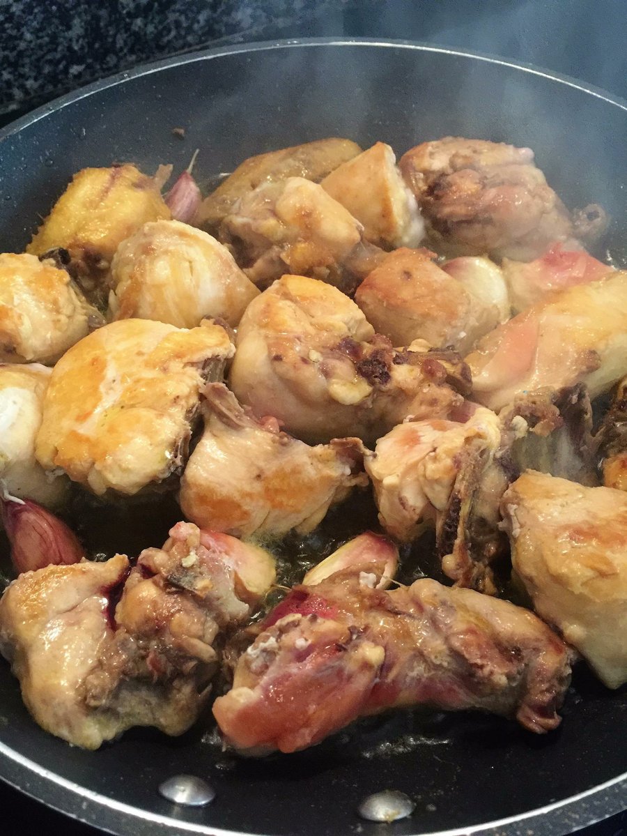 con el pollo troceado,( lo podemos pedir en la carnicería y nos lo trocearan con mucho gusto, si no lo podemos hacer nosotros, procurando que estos trozos no sean muy grandes, para evitar que la cocción se alargue mucho) vamos a poner una sartén o cazuela al fuego medio alto, ( mi encimera es de 0 a 10, y lo suelo poner en el 7), y añadiremos unas cuatro cucharadas de aceite virgen extra de oliva, echaremos nuestro pollo y los ajos, que previamente quitaremos de la cabeza, y con el dorso del cuchillo daremos un golpe para que suelten todo su sabor.