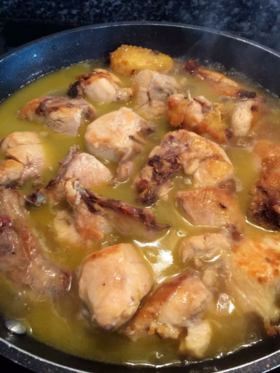 Una vez conseguido el color dorado claro, y que veamos que no suelta sangre por ningún lado, añadimos el vino (Si has optado por la pastilla de caldo, es hora de ponérsela) y dejamos que evapore un poco el alcohol. Eso será aproximadamente un par de minutos, acto seguido añadimos el agua, y lo vamos a tener cociendo unos 25/30 minutos, hasta que veamos que el pollo esta tierno, si veis que le falta caldo durante la cocción, podéis añadir más agua.
