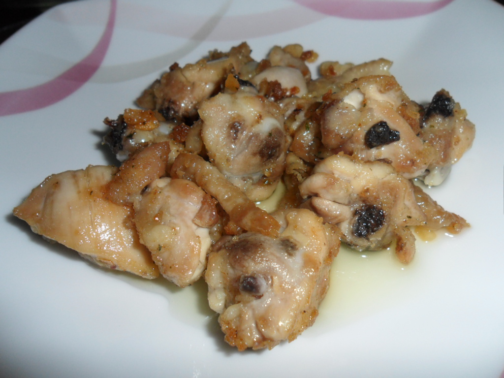 4º - Añadimos un chorrito de vino blanco y subimos un poco el fuego , echamos el ajo que troceamos , pimienta al gusto y un poco de perejil . Removemos el pollo hasta que se dore el ajo y servimos .