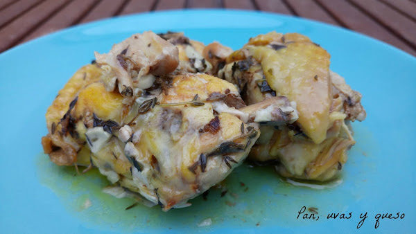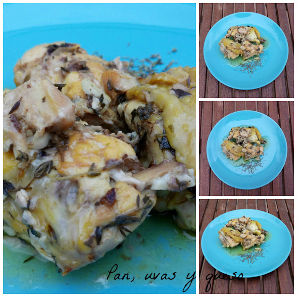 En ese momento echamos el cava y el tomillo. Dejamos que el cava de un hervor y bajamos el fuego. Tapamos la cacerola y cocinamos hasta que el pollo esté hecho.