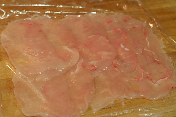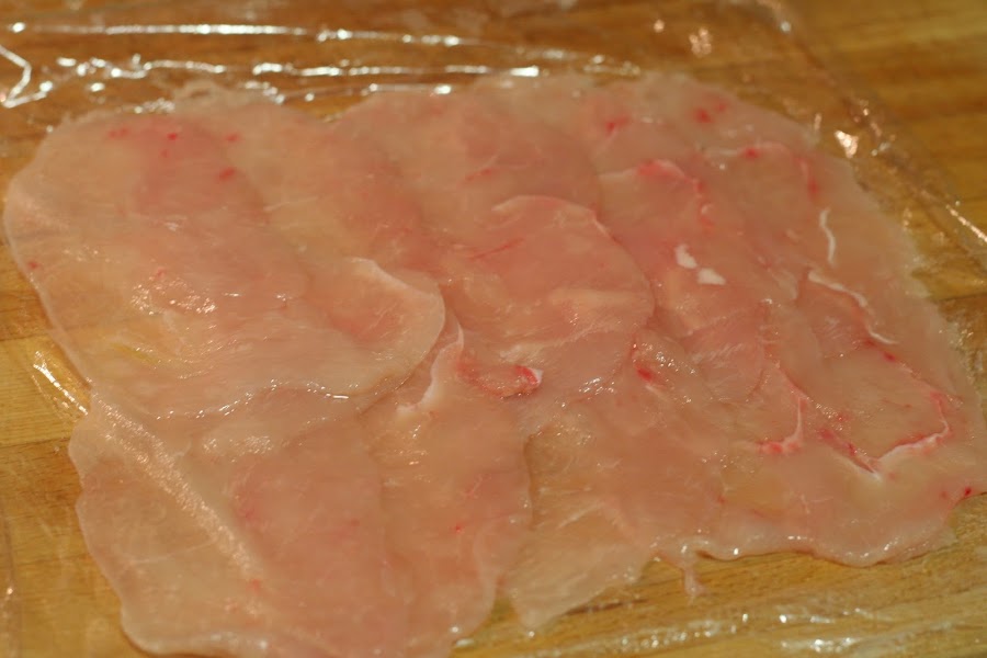 Para preparar esta receta necesitamos congelar las pechugas con antelación. Partiendo de aquí, sacamos las pechugas del congelador y dejamos que se descongelen un poquito pero que aún estén duras. Las cortamos muy finamente con la ayuda de una cortadora de fiambre (como si fuésemos a hacer un carpaccio), si no tenemos cortadora, podemos hacerlo igualmente con un cuchillo muy bien afilado.