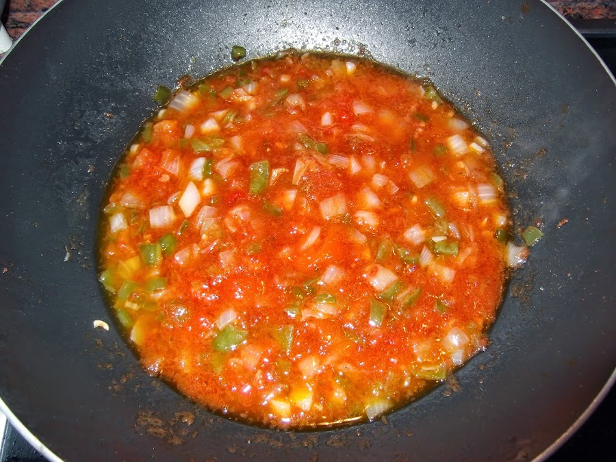 A continuación, hay que realizar las verduras, cortamos en trozos pequeños el ajo, la cebolla y las dos clases de pimientos. Añadimos a la sartén donde hemos frito lo anterior el ajo, la cebolla y el pimiento verde (ya que el rojo es de lata, aunque podéis utilizar natural y entonces se añadiría ahora). Si es necesario, añadir más aceite a la sartén. Saláis y esperáis a que se pochen las verduras.