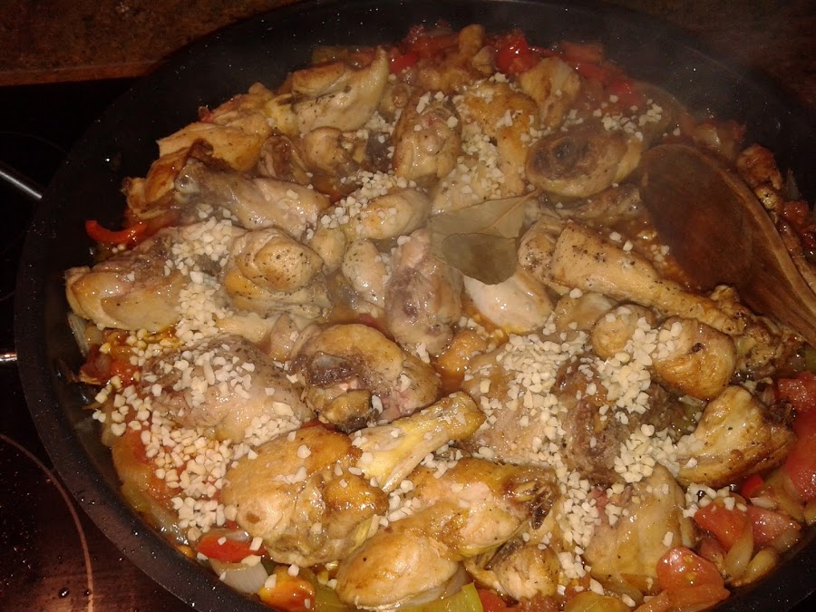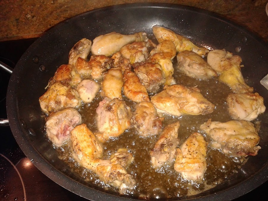 1 pollo entero cortado a cuartos y de cada cuarto hacer 3 o 4 trozos.