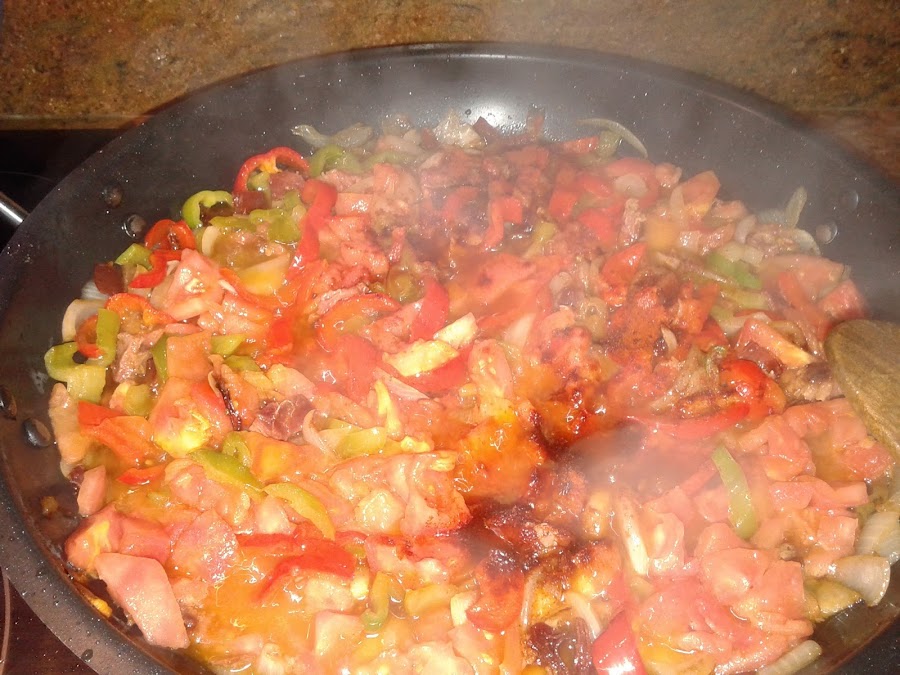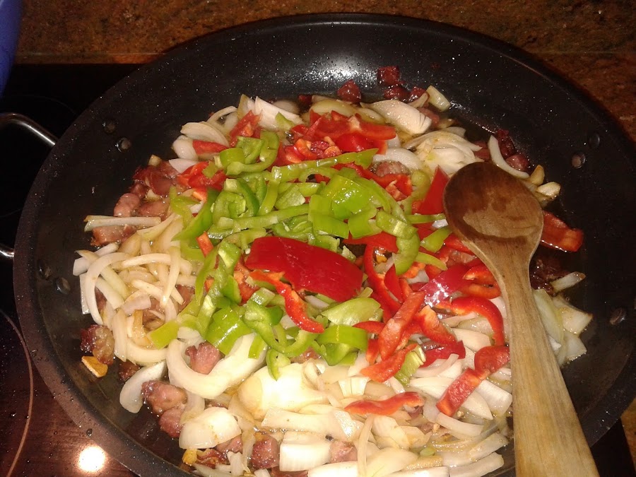 1 pimiento rojo, 1/2 verde y una cebolla cortado en juliana.