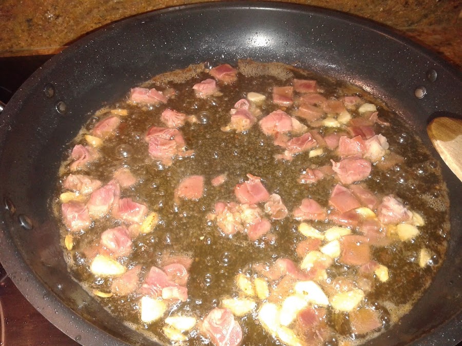 Añadimos los taquitos de jamón y los rehogamos un momento.