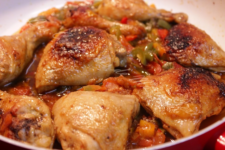 Cortar los muslos a la mitad, salpimentar y dorarlos con el aceite en una cazuela hasta que estén dorados, sacarlos y reservarlos. Limpiar y trocear los pimientos y el tomate. Freír 10 minutos en la cazuela. Incorporar el pollo, tapar y hacer a fuego suave 45 ó 50 minutos. Rectificar de sal, añadir la almendra molida y dar unos hervores tapado o destapado según el exceso de salsa. Se puede acompañar con lo que queráis (patatas, arroz, cuscus, etc.)