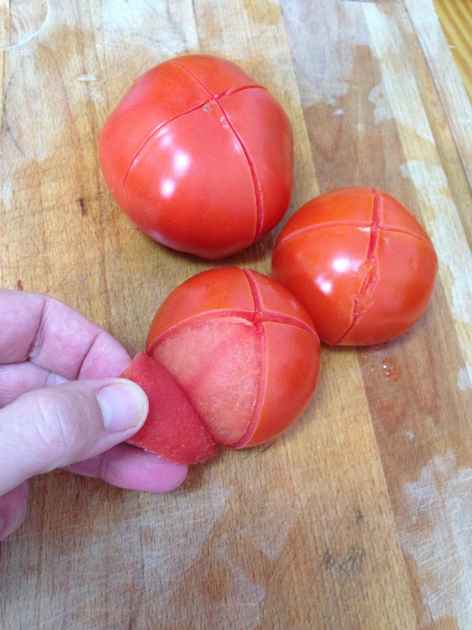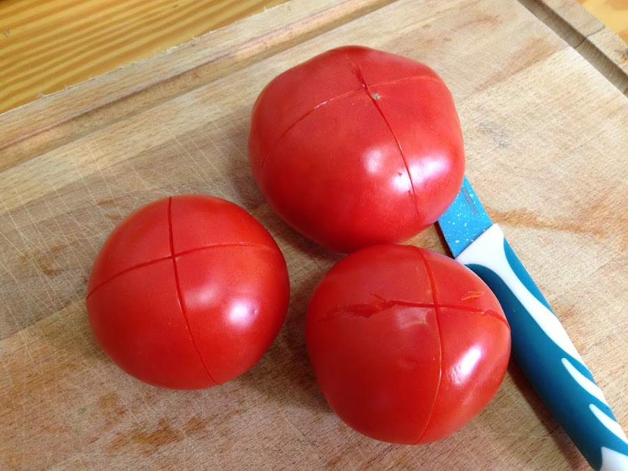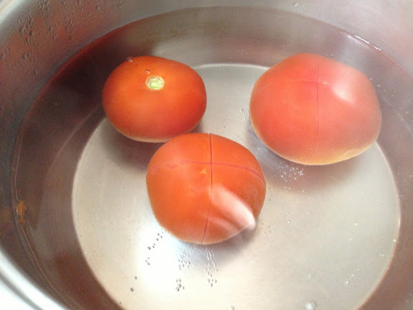 Practicamos una incisión en forma de cruz en la parte de abajo de los tomates (como en la foto), calentamos agua en una olla y cuando esté hirviendo metemos los tomates en ese agua durante 1 minuto y retiramos.