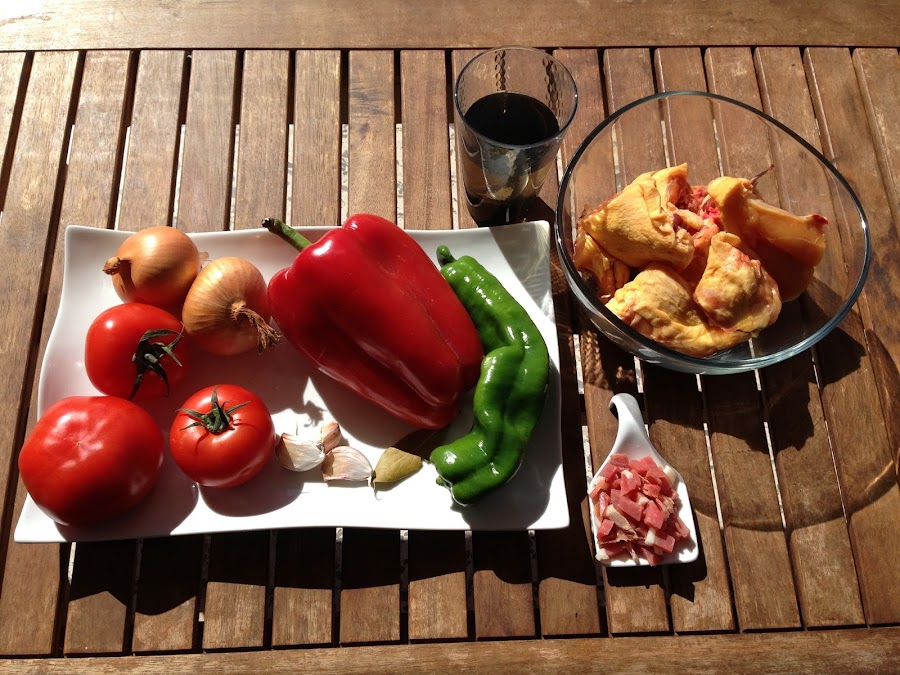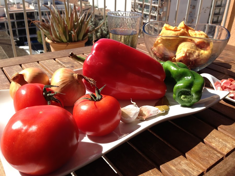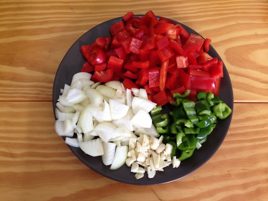 Picaremos en trozos que no deben ser demasiado pequeños el pimiento rojo, el medio pimiento verde, los tres ajos y las dos cebollas y reservamos.