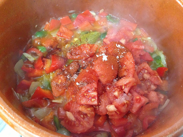 Le añadimos también 1 cucharada de pimentón dulce, una pizca de sal y una cucharada de azúcar para contrarestar la acidez del propio tomate.
