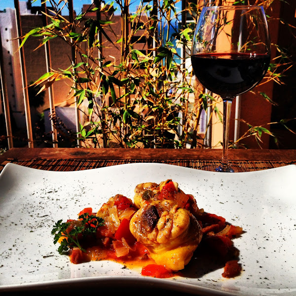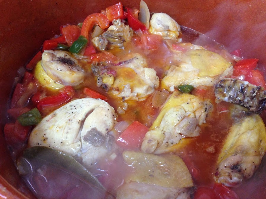 Añadimos el vaso de vino entero y dejamos al fuego fuerte unos 20 - 25 minutos. Vamos removiendo y girando el pollo 2 - 3 veces durante la cocción.
