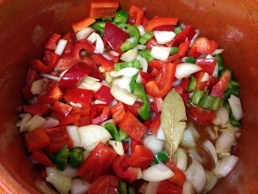 En ese mismo aceite vertemos las verduras que tenemos picadas. El pimiento rojo, el pimiento verde, la cebolla, el ajo y una hoja de laurel. Añadimos algo de sal y lo vamos pochando todo.
