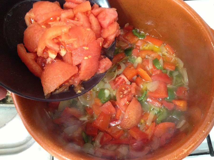 Lo tendremos así, pochando, unos 6 minutos, hasta que veamos que la cebolla se va poniendo transparente. En ese momento podemos añadir el tomate que tenemos cortado.