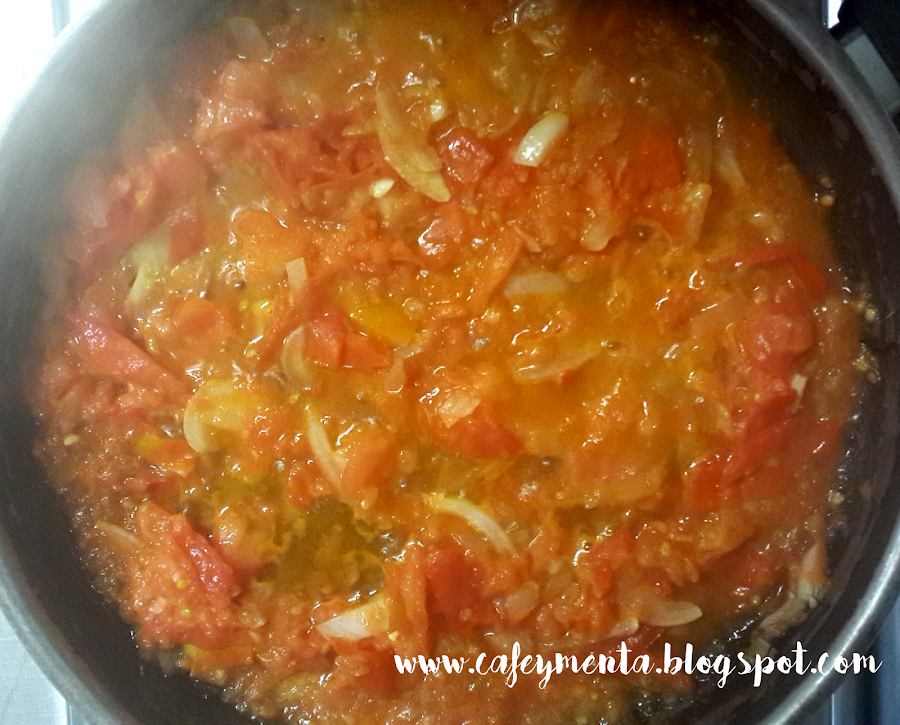 2. Cuando el pollo este dorado lo retiramos junto con los ajos, y en la misma sartén pochamos un poco la cebolla. Cuando esté casi lista le agregamos el tomate rallado previamente.