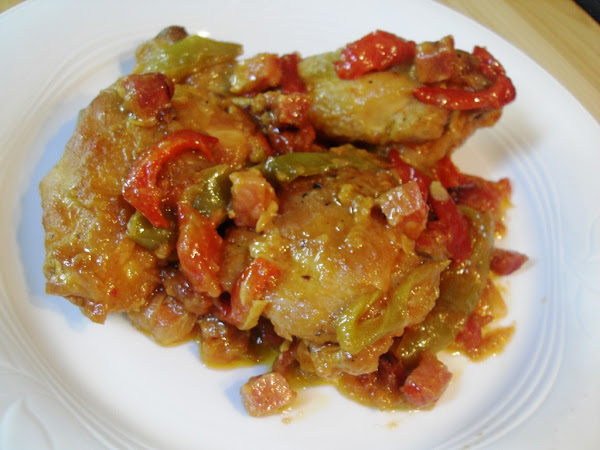 Si se puede aprovechar el aceite, añadir la cebolla picada en juliana y pochar a fuego bajo, con cuidado que nos pasemos y se queme. Seguidamente incorporar los pimientos y se deja pochar todo junto y que queden algo crujientes, que aún se tienen que guisar más. Sazonar.