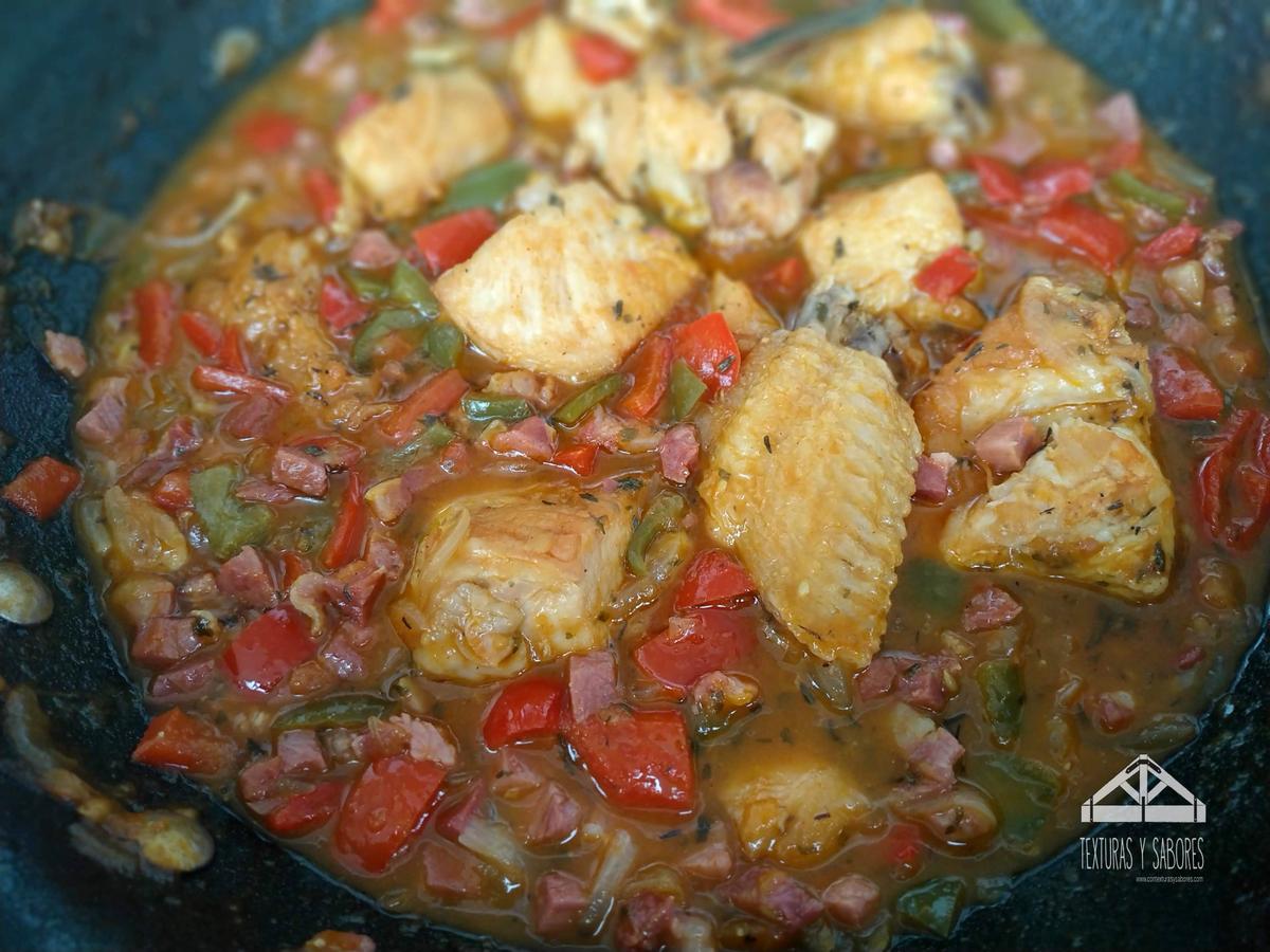En la misma sartén o parisien rehogamos la cebolla, el ajo, junto con los dados de jamón, incorporar los pimientos cortados en brunoise, seguir rehogando. Agregar el vino blanco oloroso (en mi caso utilizo la Sultana) cuando se evapore el alcohol se incorpora el tomate rallado. Rectificar de sal si es necesario, espolvorear el perejil, romero y un poco de pimentón dulce, remover para que coja los sabores y dejar cocinar a fuego medio la salsa junto con el pollo dorado que hemos dorado previamente.