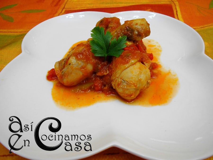 El pollo queda rico rico, jugoso, y el tomate junto con los pimientos le da un sabor exquisito. Además no hay porqué cocinarlo en el momento, está buenísimo para el día siguiente.