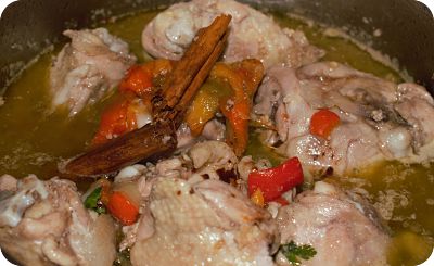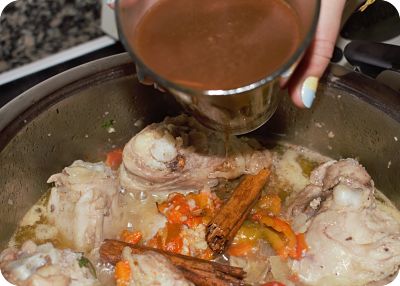 En un vaso de caldo caliente disuelve el Cola-Cao. Incorpóralo al pollo y pon también el palo de canela. remueve y deja cocer hasta que el pollo esté tierno y la salsa haya reducido ( unos 45 minutos ). Si lo necesitas puedes añadir un poco de caldo de ave ( a mí no me hizo falta ).