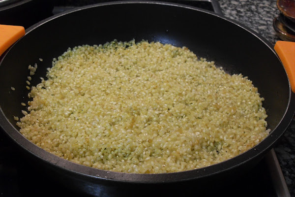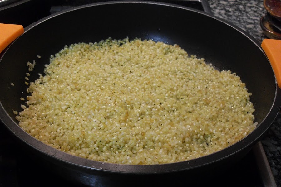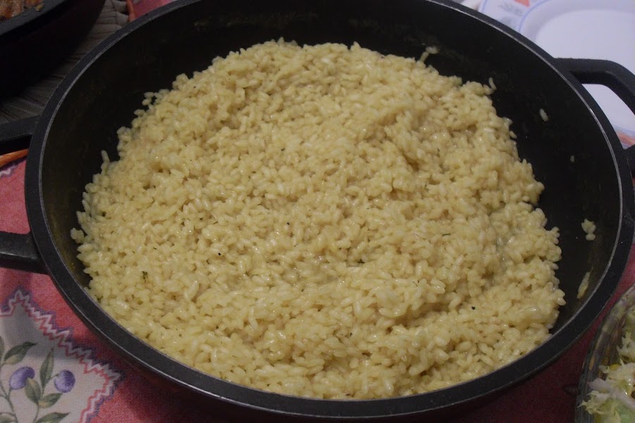 Cocer el arroz según las instrucciones del fabricante, pero primero rehogar el arroz con la cebolla pochada, añadir el agua necesaria y 1 cucharada de curry, 1/2 de cúrcuma, una pizca de cilantro fresco y 1/2 cucharada de perejil picado. Rectificar de sal.