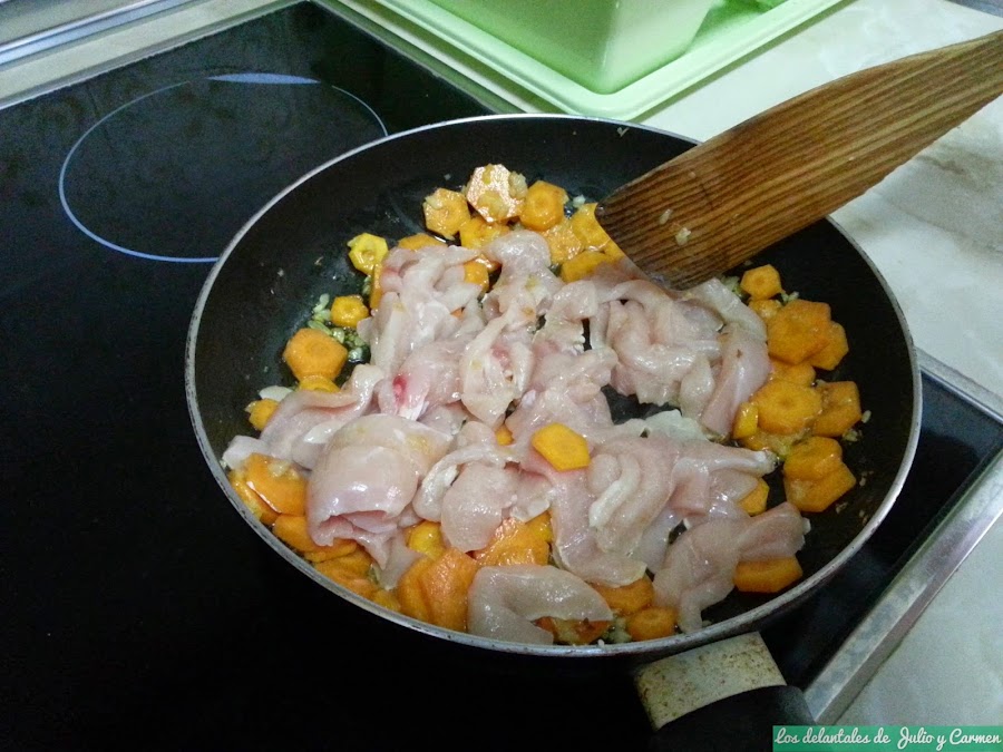 Cuando la zanahoria veamos que ya está bien cocinada, vertemos el pollo en tiras y removemos, subiendo un poco el fuego.