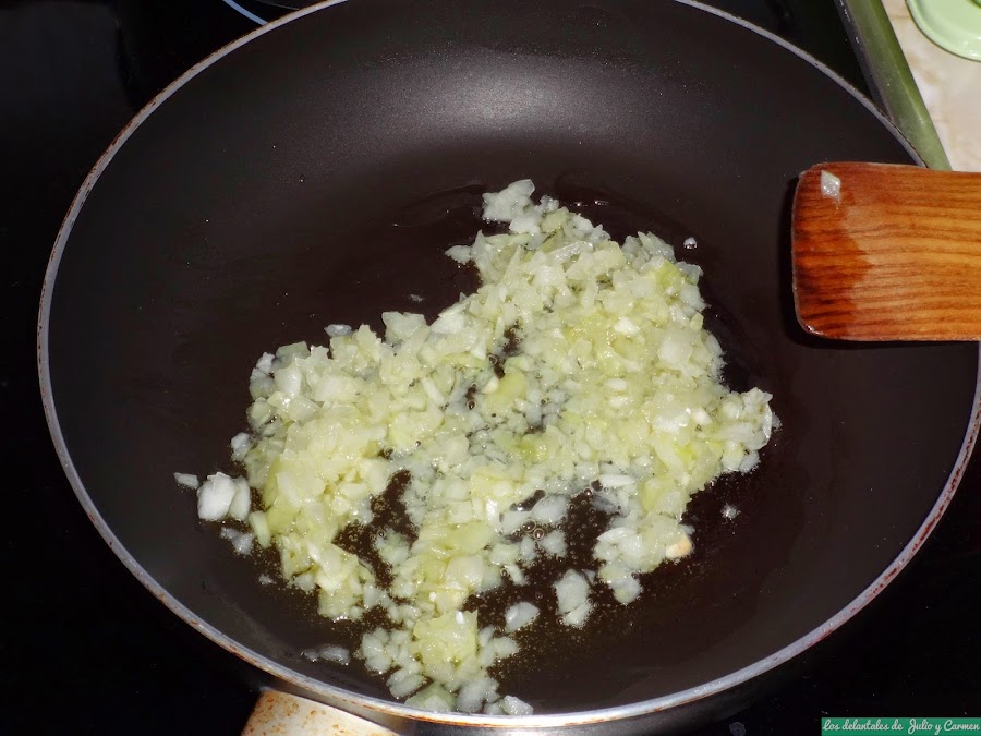 En una sarten, ponemos a pochar a fuego bajo la cebolla. Cuando comience a dorarse, echaremos las zanahorias y dejaremos que se cocinen bien, removiendo de vez en cuando.