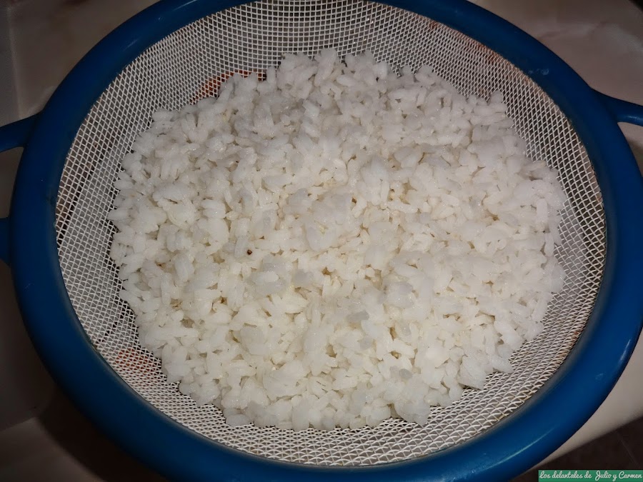 Pondremos el arroz a cocer en una cazo con agua hirviendo con sal. Cuando este listo, lo escurrimos y pasamos por agua fría. Reservamos.