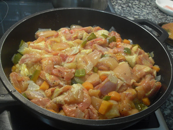 Poner un poco más de aceite en la cazuela a calentar y dorar el pollo unos 5-6 minutos por todos los lados, junto las verduras.