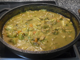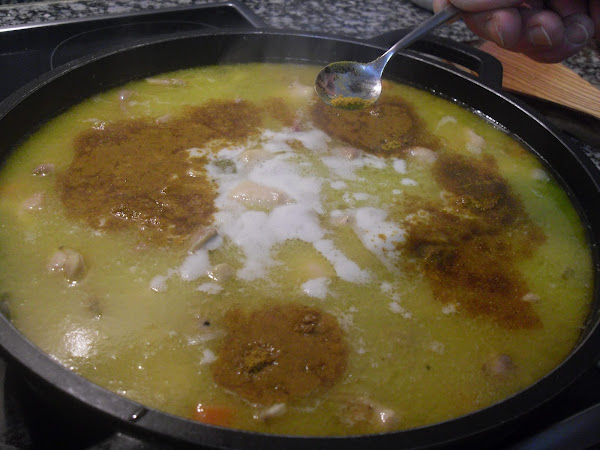 Echar la leche de coco y las especias. Mezclar bien y cocinar a fuego bajo, hasta que espese un poco. Agregar el caldo de pollo, cocer 5-6 minutos.