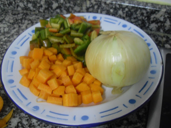 Poner a pochar en una sartén con un poco de aceite a fuego medio la cebolla, seguidamente el ajo y a continuación el resto de las verduras. Sazonar.
