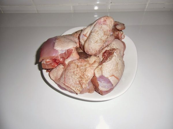 Lavamos el pollo, lo secamos, le hacemos unos cortes a los muslos para que se cocinen mejor y salpimentamos