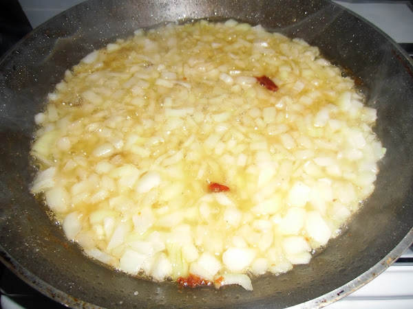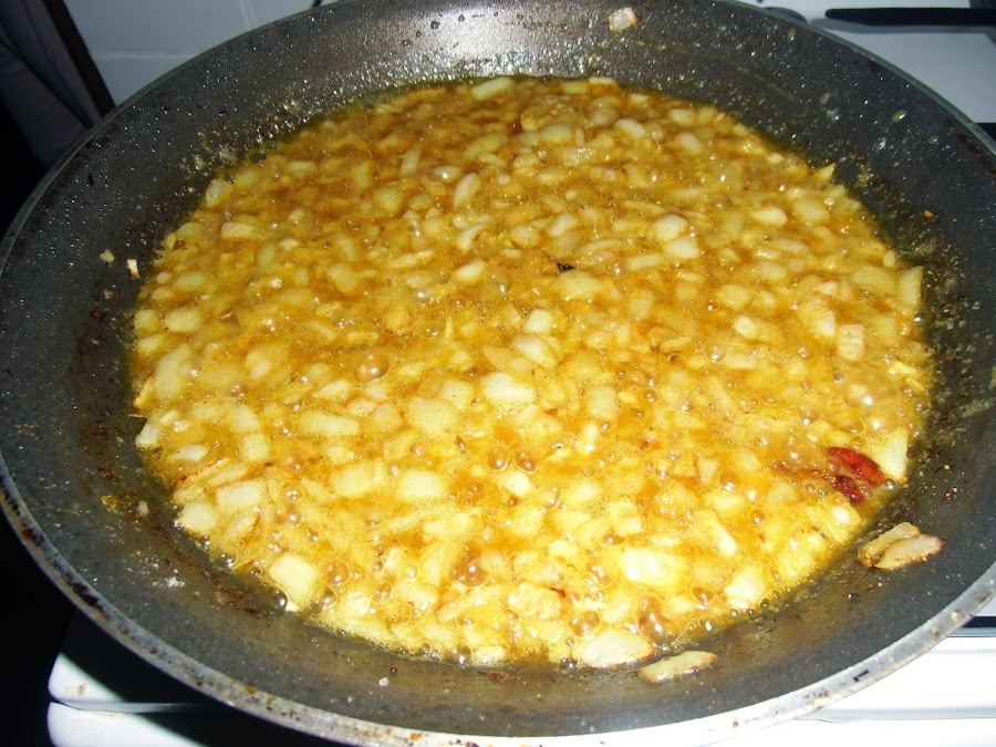 En el mismo aceite del pollo pochamos las cebollas cortadas con la cayena, y añadimos sal.