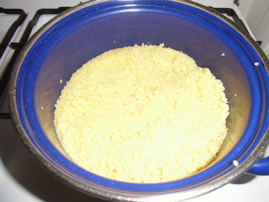 Cuando hierva lo retiramos del fuego y añadimos el cous-cous, removemos y dejamos reposar 3 minutos