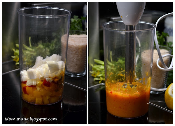- Troceamos media cebolla, medio pimiento y el chili, y lo ponemos en el vaso de la batidora junto con el ajo, la miel y las especias. Batimos hasta tener una pasta homogénea.