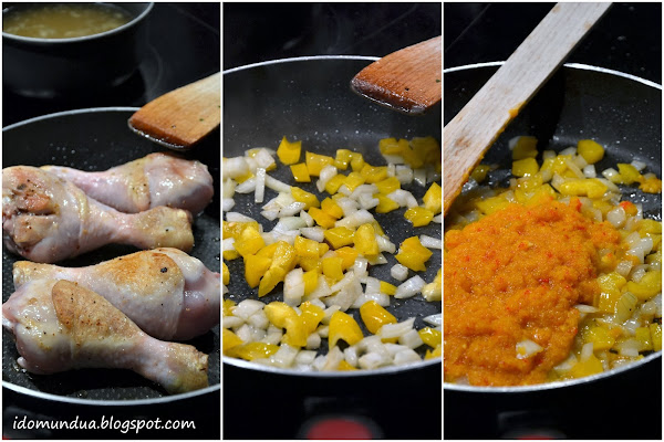 - En la misma sartén, añadiendo un poco más de aceite si hiciera falta, pochamos la media cebolla y el medio pimiento restantes, picados finamente. Cuando empiecen a ablandar añadimos la pasta anterior (nuestro curry casero). Removemos y dejamos que se cocine unos 5 minutos.