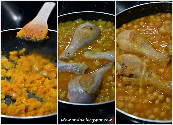 - A continuación añadimos el caldo caliente, los garbanzos y el concentrado de tomate. Mezclamos bien y dejamos que cueza a fuego suave y tapado durante 30 minutos. Movemos de vez en cuando.