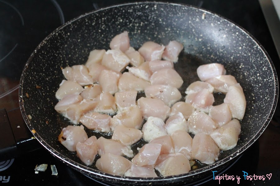 Retiramos la cebolla y doramos el pollo en esa misma sartén.