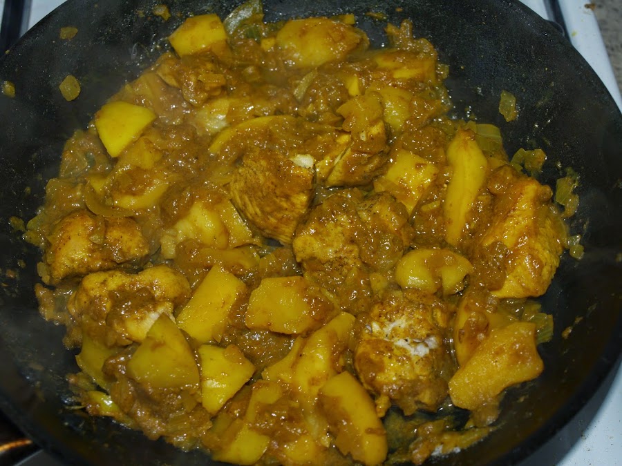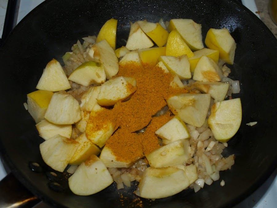 - A continuación añadimos los trozos de manzana y el curry (y el comino) y cocinamos un par de minutos removiendo bien, sobre todo al principio, para que se integre bien el curry y cubra el resto de ingredientes.