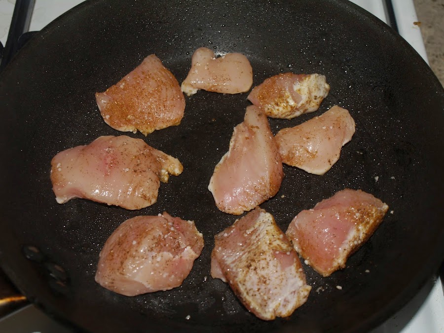 - Cortamos el pollo en trozos más bien grandes y lo doramos, nada más, en una sartén con un poco de aceite. Reservamos.
