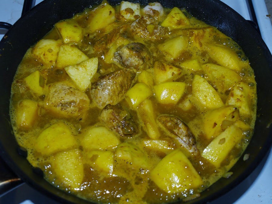 - Añadimos entonces los trozos de pollo y el caldo o agua y dejamos cocer unos diez minutos, removiendo de vez en cuando. Vigilamos el nivel de líquido y añadimos más si vemos que se consume demasiado. Si por el contrario vemos que queda más líquido podemos aumentar algo el calor y añadir una cucharada de maizena o Husk (de Husk mejor media, o incluso menos. Espesa muchísimo!) para que ligue un poco.