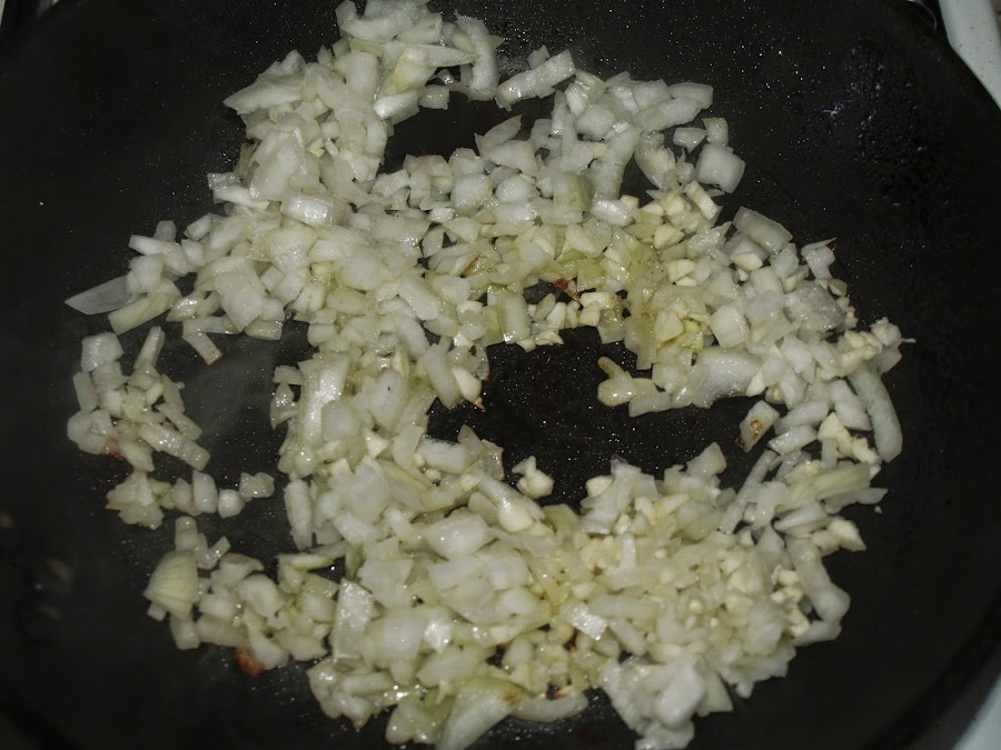 - Picamos finito la cebolla y los dientes de ajo y los pochamos en la misma sartén. Si hace falta, añadimos algo más de aceite.