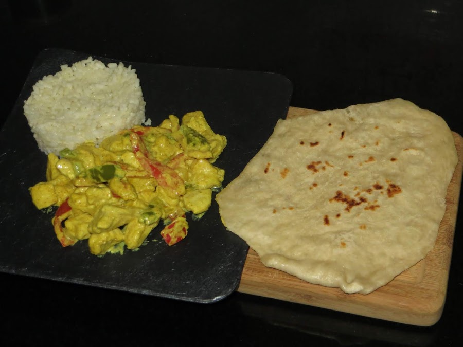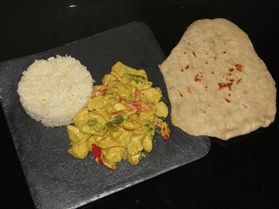 Y ahora nos ponemos con el pollo al curry, colocamos en una sartén un poco de aceite y ponemos a freír la cebolla con el ajo y los dos tipos de pimiento, los podéis cortar como más os guste, salpimentamos y dejamos que se poche todo durante diez minutos. Luego añadimos el pollo salado y dejamos que tome color. Mientras tanto en otra sartén o cazo juntamos la nata (crema de leche) para cocinar y el curry. Cuando veamos que el pollo está cocinado añadimos la nata (crema de leche) con el curry y dejamos que se cocine todo junto durante cinco minutos y ya está listo para servir. Colocamos en el plato el arroz y al lado el pollo al curry servimos a cada uno de nuestros comensales un pan y todos a degustar una rica comida hindú.