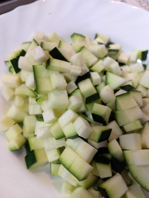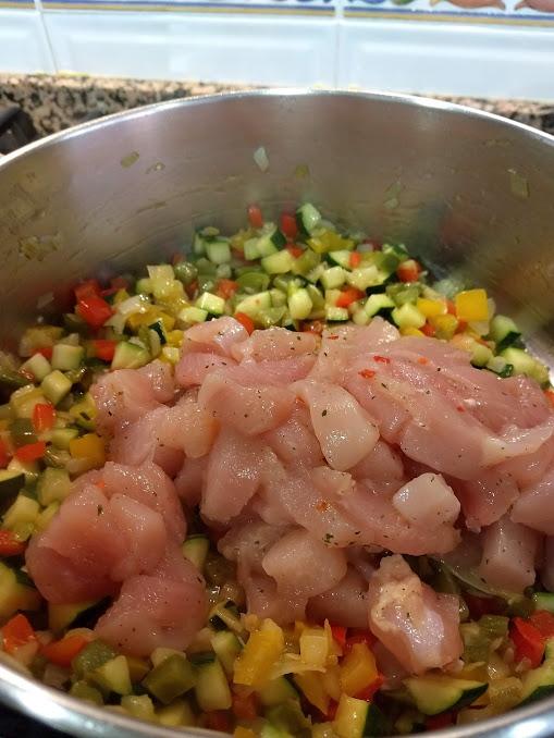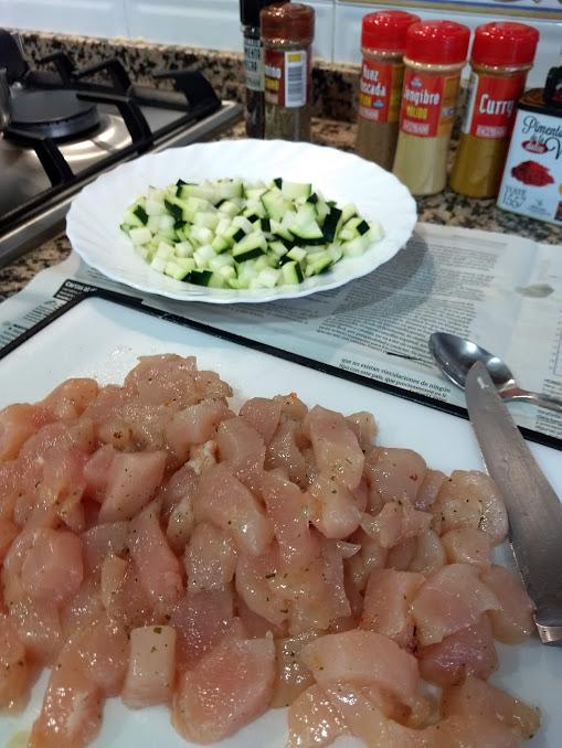 Cortad la cebolla y los pimientos en trocitos muy pequeños, como de 1cmx1cm y el ajo muy pequeñito. Cortad el calabacín también en trocitos muy pequeños y lo reserváis. Cortad la pechuga en trocitos pequeños de unos 2cmx2cm y lo reserváis.